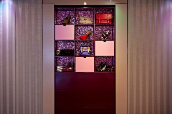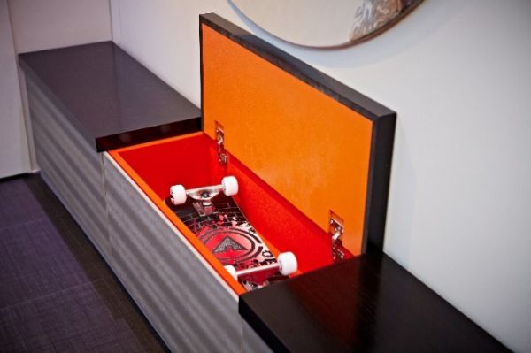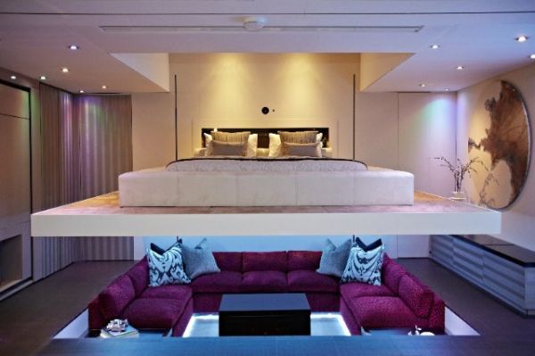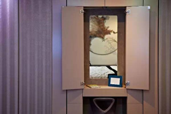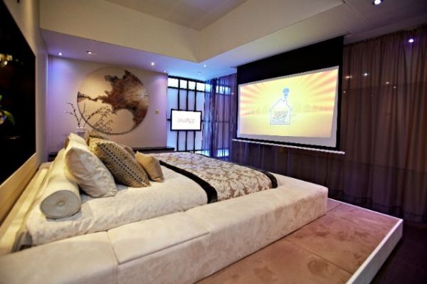 触摸按钮,是一个可升降的床,同一个空间,通过设计可变成卧室或是一个家庭影院。