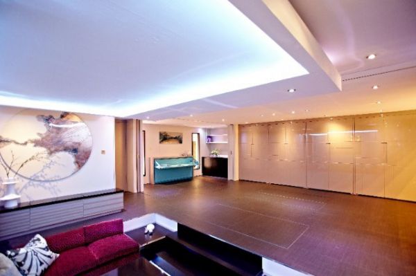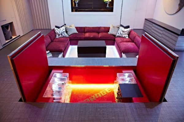 利用科技创造一切的空间,进门硕大的下沉式客厅,艳丽的沙发颜色和深色的地板白色的墙壁,形成一种现代豪华感。