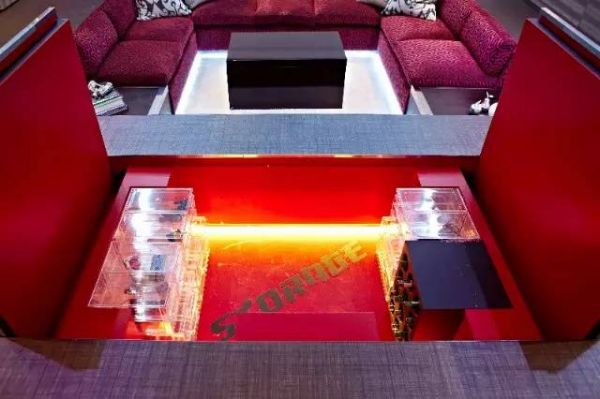 沙发前是陷下去的小空间,可以作为酒柜,经过折叠后摇身一变又成为了饭桌。