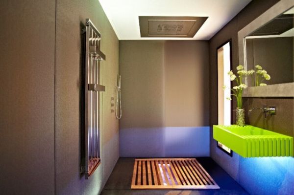 进入浴室,推开木质隔板,是下沉式的浴缸。整个空间充满了设计感,家具配饰现代感十足。