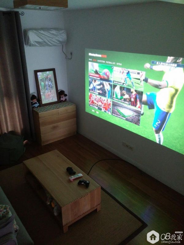 影视厅已安装投影仪,直接投到墙壁上的,等之后资金宽裕了,再购买幕布~