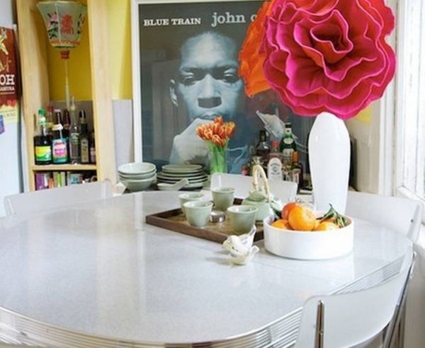 亮黄的餐厅,喜欢吗?纯白的玻璃餐桌上放着一朵大红花,确实给增添了不少光彩