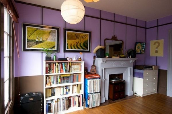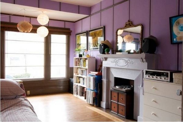 一边是白色的柜子,另一边是素净的床,摆设普通却有不平凡的灯饰,其实浪漫的紫色和白色混搭就已经很出色啦