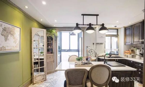 ▲ 厨房和餐厅一体,中间是个岛台兼餐桌,北面阳台放了冰箱做了吧台