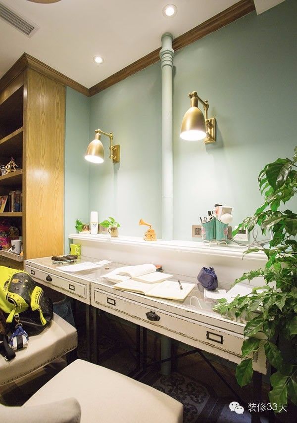 ▲ 一面绿色的硬包墙面,配上羊皮卷式的世界地图,浓浓复古文艺范儿
