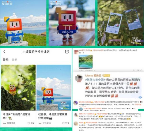 本次国色采风之旅作为“冠珠中国传统色推广计划”的特别企划,也是首次设计师国色游学活动。冠珠“小红砖”化身国色采风使者,跟随设计师们的步伐开启游学之旅。11.8w+用户、粉丝积极响应,通过线上线下等多元方式一同打卡大美山河,于自然、山水间去发现国色、收藏国色,传播东方意境美学。