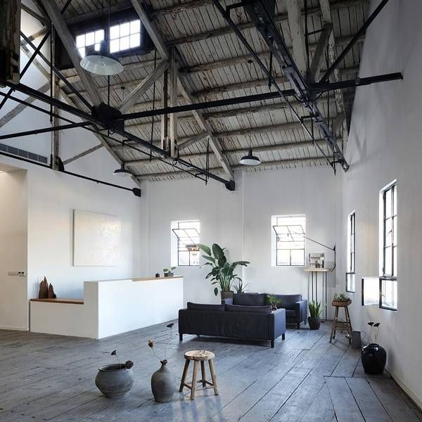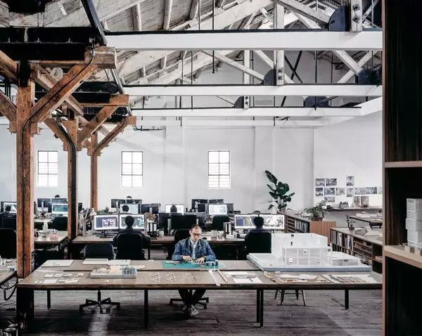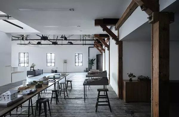开放的工作区域内,木屋架在白墙壁的衬托下更显斑驳。