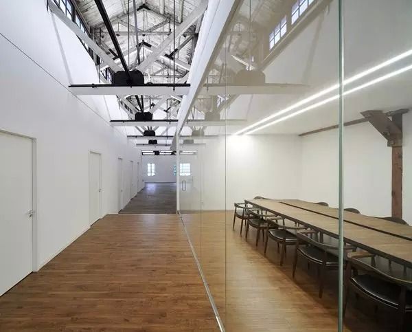 会议室和小办公室挤压出一条走道,贯通整个空间。所有的墙面刷白,不是对现代主义的致敬,而是类似博物馆里的展墙,让屋顶和地面成为前景。