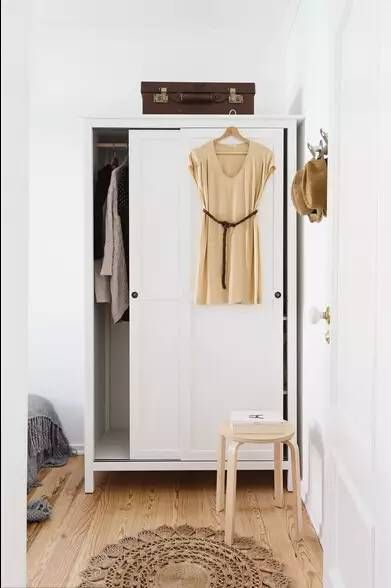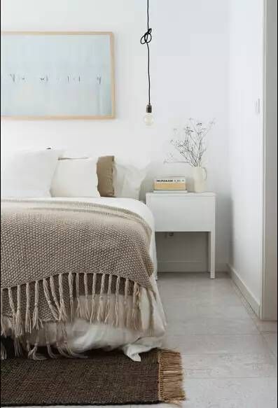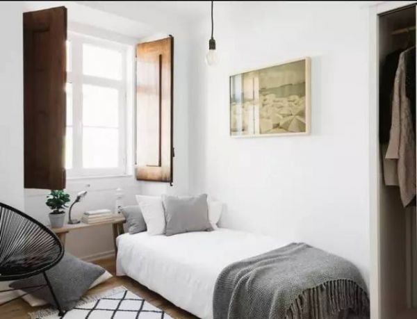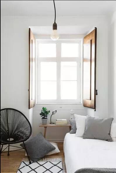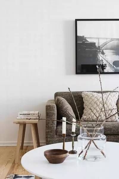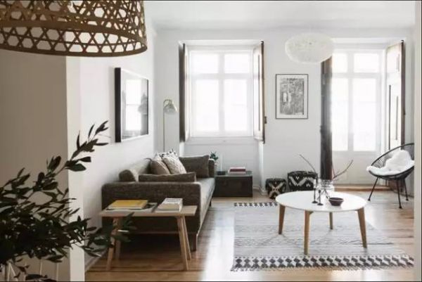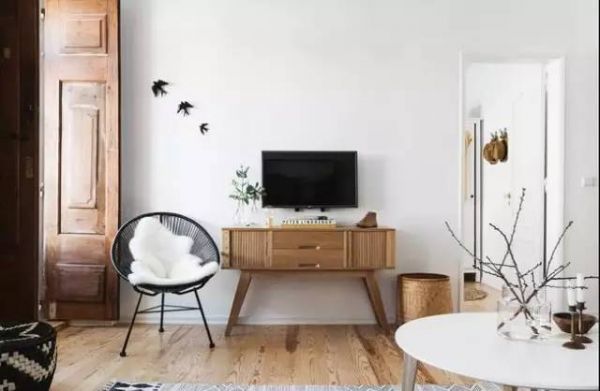 整个空间被定义为纯白色的基调,搭配木质地板和家具,显得整洁清爽,原先厚实的木门设计师在外加了两扇玻璃门,白天将木门打开,阳光可以透过玻璃门窗穿透进来,绿植,枯枝,毛毯,在良好的采光下这里显得十分的温暖。