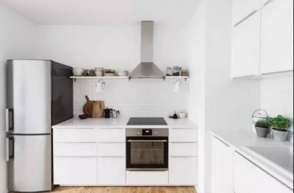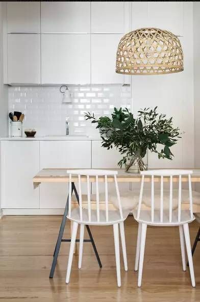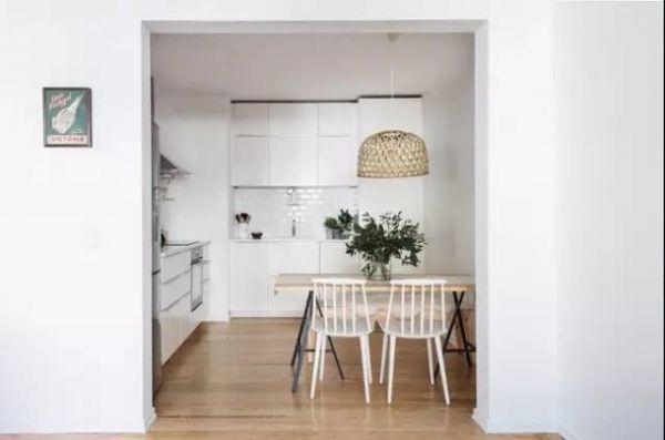 纯白色的厨房区域搭配了一张淡色木质餐桌, 整排的储物柜将杂物收纳,整个厨房区域显得干净整洁。
