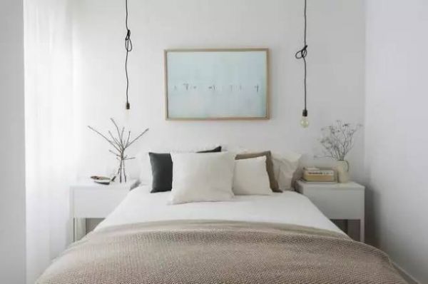 卧室的空间并不算大,设计师避免用过多的家具造成杂乱感,而是以简约的方式勾画这块空间,垂吊而下的钨丝灯让电缆也随意的暴露在视线内,纯色的棉麻织品,床头两侧的摆设,简简单单却又十分的温暖。