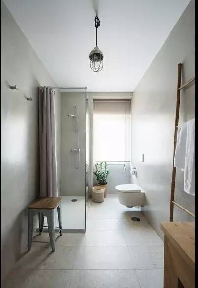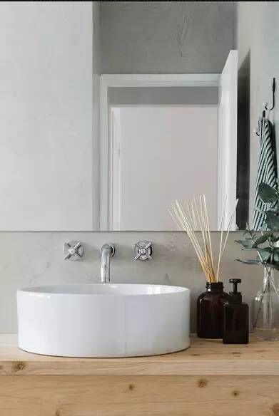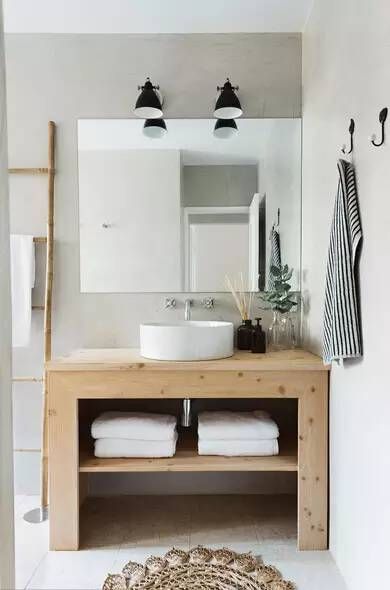 盥洗室用混凝土的墙面塑造极简风,洗浴用品也相应的简化,设计师用木质台面给这个冷色调空间带来温暖。