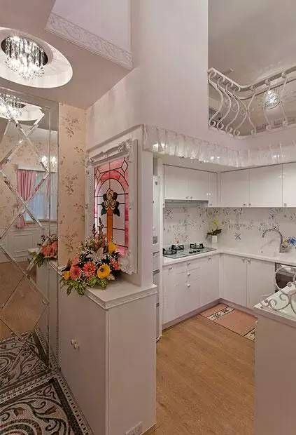 玄关一侧的墙面是菱格型的穿衣镜效果非常棒,在玄关墙的另一侧就是开放式的厨房空间,厨房是日式杂货风