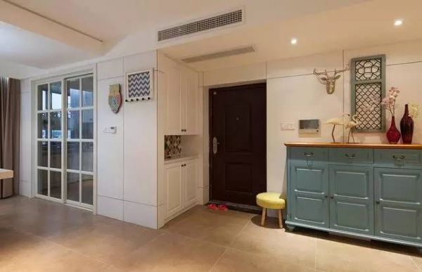 一开始准备就是简简单单的装修,但是在网上看了很多装修过的家,喜欢的不得了,把想法说给设计师听,融入了一点美式的风格,那就当混搭风格的好了,进门处,右边是储藏衣柜和鞋柜