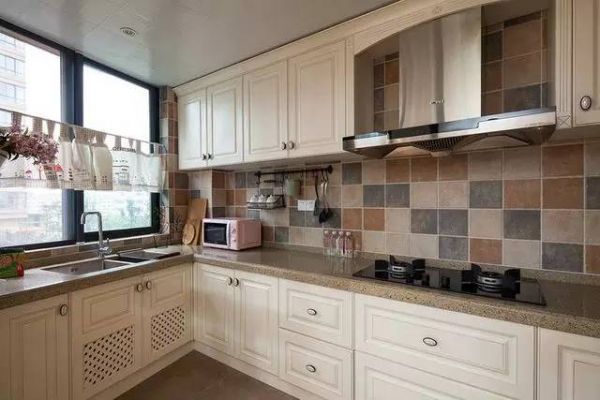 厨房就是有点小小美式的风格,墙面是用的拼砖,颜色很好看,橱柜的颜色是米白的