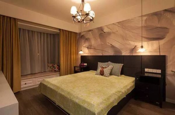 主卧。我很喜欢卧室的背景墙,晚上正好灯光打开真的是很漂亮,还有我最爱的飘窗
