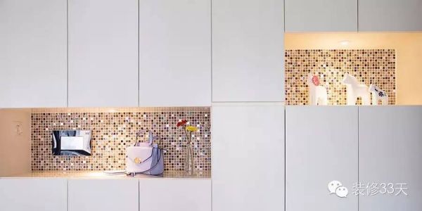 ▲ 柜体中段留空设计,高低错落,用马赛克做背景配合隐藏灯光营造气氛,纯白色的柜门