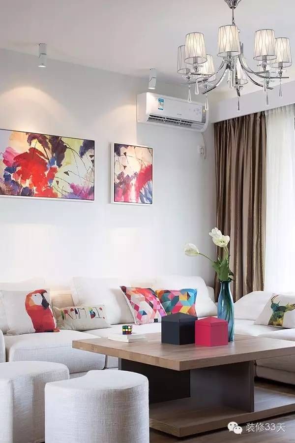 ▲ 用彩色的装饰画和彩色的抱枕等软装点缀,从素雅的基调中跳跃出来,增强对比感和层次感