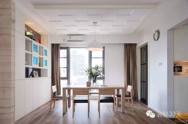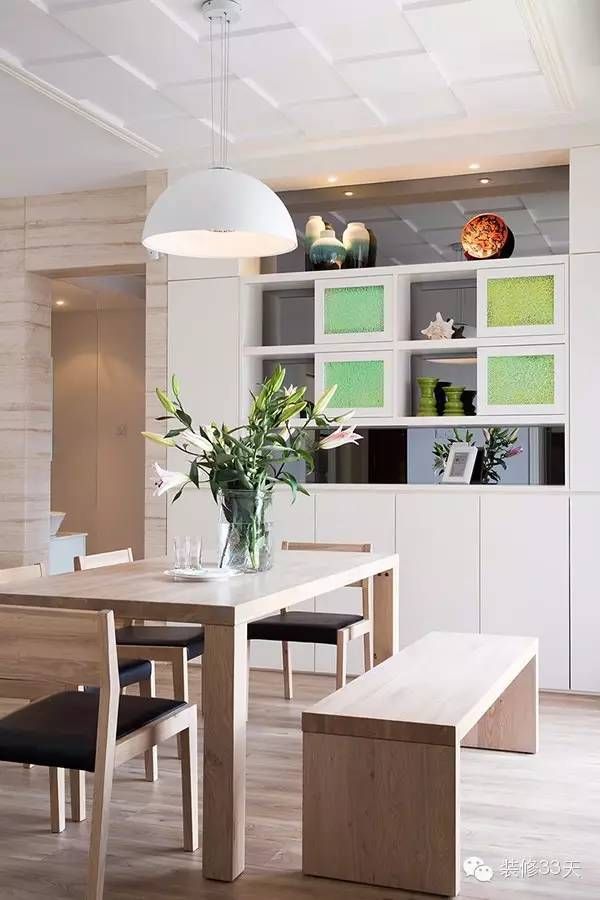 ▲ 木纹餐桌椅造型简洁干练,餐边柜用灰镜做底面,用彩色的艺术玻璃点缀,让空间多了几分时尚元素
