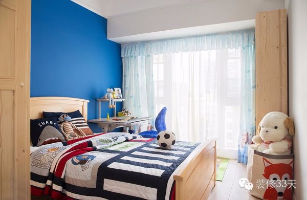 ▲ 儿童房用蓝色调乳胶漆做床头背景,色彩的运用增加了童趣