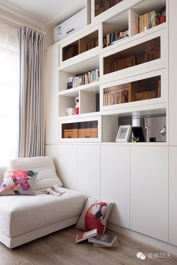 ▲ 一整面墙的书柜,开放和封闭结合,收纳和展示并存