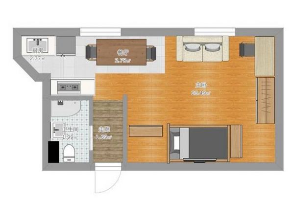 一居室的房型,床下设计了电视机柜,双人沙发立与窗边。靠墙一面是收纳柜。