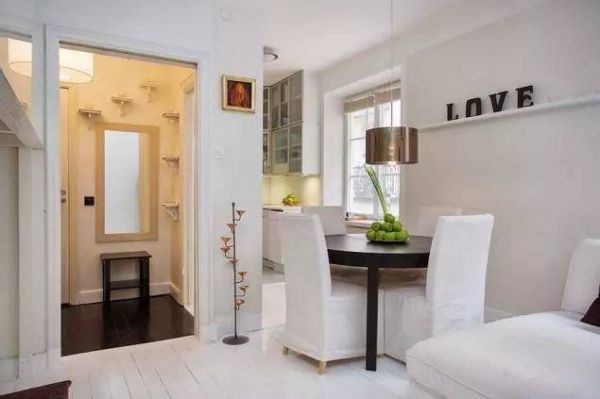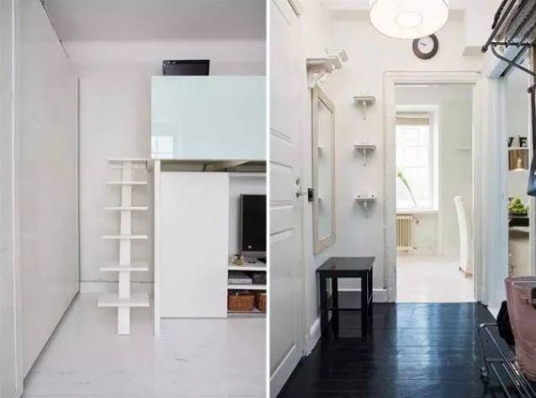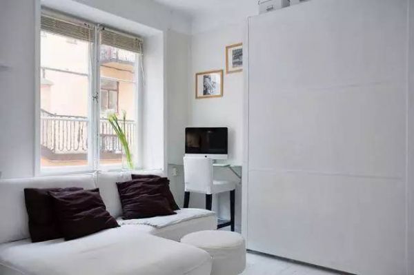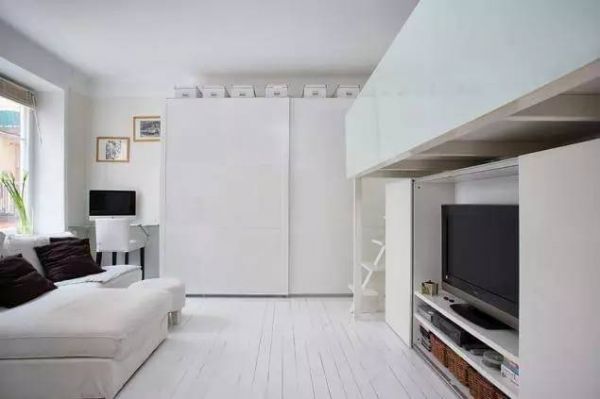 29平米的单身公寓,绝对颠覆小公寓带来的拥挤映像!几乎全白的内饰在视觉上扩大了空间感,开放式的空间也是必备,简单的黑白搭配经典又时尚,卧室被安置在了电视机柜的上方,十分的实用!