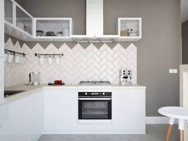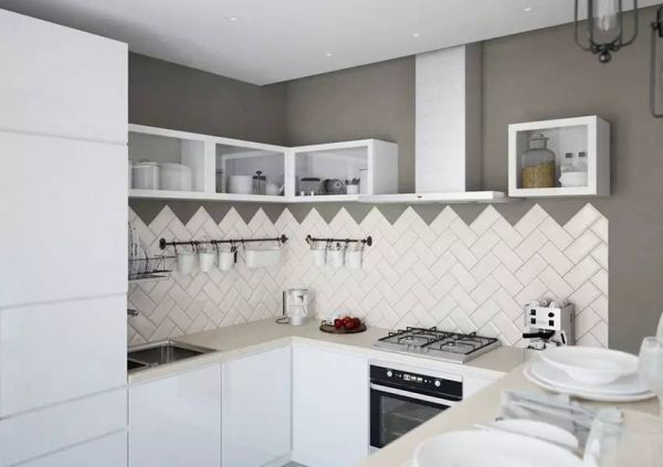 ▲L形的操作台十分便捷,上下都安装有储物柜,让空间不大的厨房也能变得十分整洁,花砖的巧妙铺贴让空间变得活泼起来。