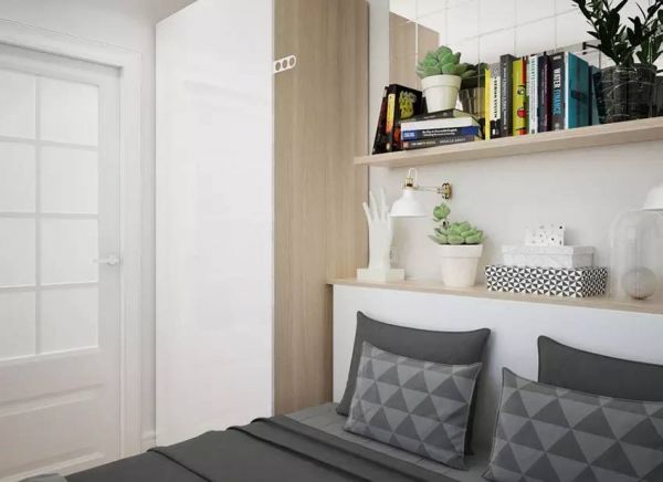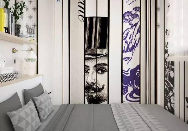 ▲卧室虽然十分狭小,长度仅仅够放一张床,但床头也设置了简单的置物架代替床头桌,趣味墙面的设计也十分吸引眼球。