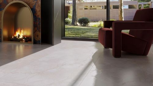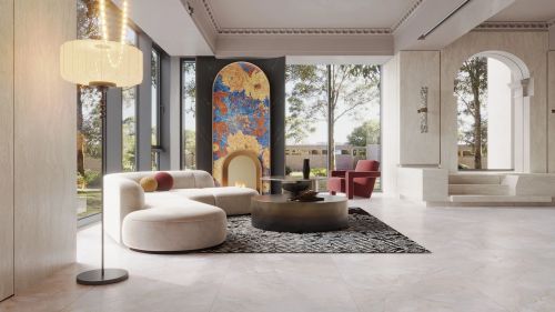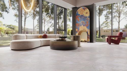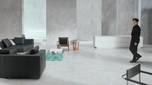 可可西里系列「巴尔颜」采用了金丝绒复刻釉2.0技术,带来犹如藏羚羊毛绒般的细腻触感,整体铺贴效果柔美而精致。当阳光洒落砖面,自然韵律与现代生活在此交融,营造出慵懒而浪漫的惬意氛围。