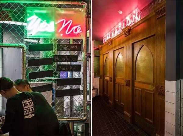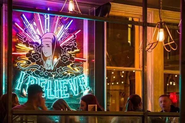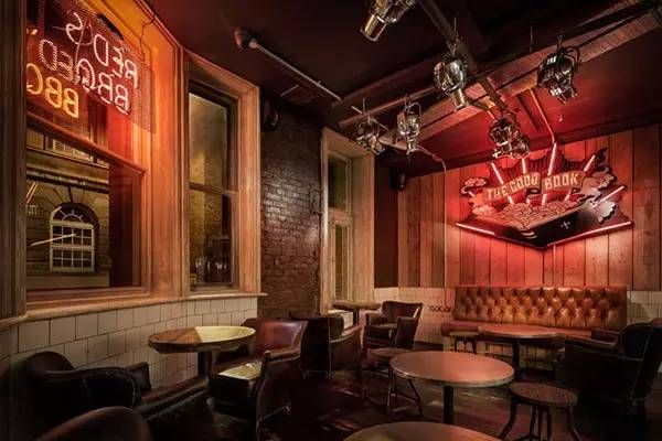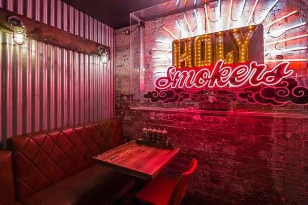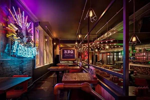 不经意路过这里的你或许很难发现这是一个烤肉店吧,酷似酒吧风格,来这里吃肉或者喝酒都不错。这间位于英国曼彻斯特 Albert 广场的烤肉店整体呈现为美式怀旧装修风格,门店 logo 用红色霓虹灯管拼接,店内有一个醒目的涂鸦吧台,刻意营造破旧感的墙面上挂有各色霓虹灯管组成灯箱。