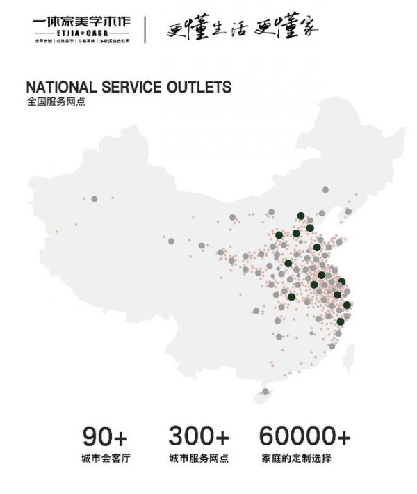 通过抖音、小红书等公域平台实现全网千万级浏览量,一体家美学木作形成优质品牌传播声量。其市场布局已拓展至90+城市会客厅、300+城市服务网点,服务超过60000+家庭,形成覆盖全国的高定家居服务网络。品牌持续为经销商提供全域流量支持与专业培训体系,研发部、工艺部、软件开发部均拥有10年以上经验,确保技术创新与品质管控。