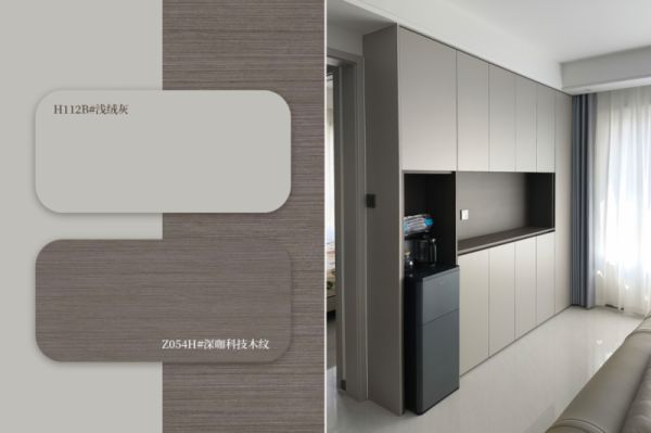 浅绒灰细腻温和,深咖科技木纹强调现代感,冷暖色调交错,彰显都市时尚气质。