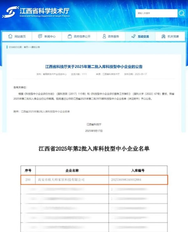 此次入库省科技型中小企业,是对欧大师家居科技股份有限公司技术成果、科技含量、创新能力等方面的充分肯定与认可。既是荣誉,更是责任。
