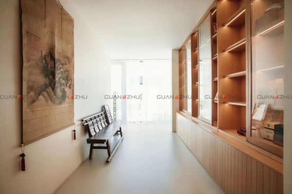 来到休闲空间,迎面看到的是一面原木书柜。温润的木纹和冠珠魔术师岩板的冷冽肌理碰撞出奇妙的设计感,整个空间给人的感觉十分安定和静谧。