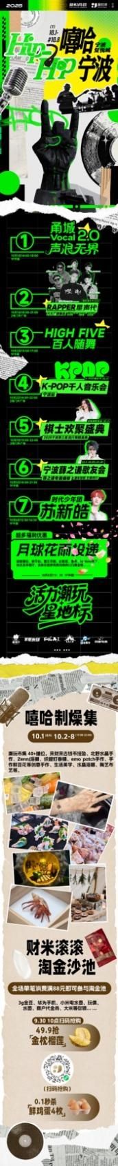 宁波复悦城于10月1日至8日打造“嘻哈宁波”国庆狂欢系列活动。集结南京及宁波六大说唱厂牌,举办星声代嘻哈音乐节,邀请幺幺零、是聂子、溜溜球等抖音达人助阵KPOPFM千人音乐会。同期推出甬城街舞盛典、明星应援、嘻哈制燥集、月球花雨等多元活动,融合文旅、国风与嘻哈潮流,为宁波市民及游客带来别具一格的假日游乐体验。