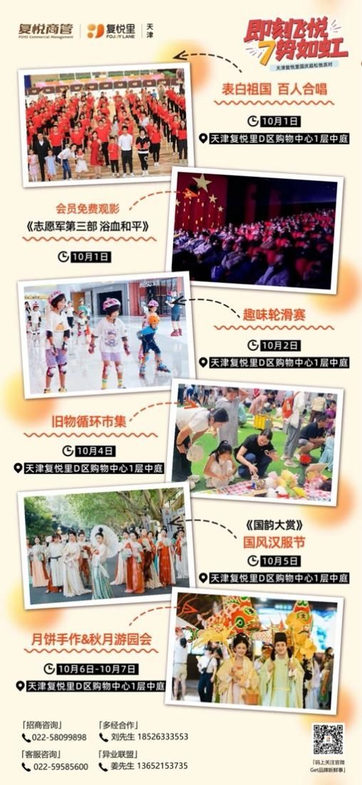 天津复悦里推出“超松弛派对”国庆&中秋特别企划,结合7周年店庆,送上“松弛Buff七重奏”福利。10月1日至8日,顾客任意消费可解锁店庆盲袋,隐藏款价值777元;满额参与抽奖,赢取滑板车、平板电脑等惊喜好礼。活动期间还举办百人贺国庆合唱、会员专场观影《志愿军第三部:浴血和平》、趣味轮滑挑战赛、儿童易物环保市集、国风汉雅集、手作月饼体验等,打造融合国风、音乐、运动与潮玩的假期遛娃空间。