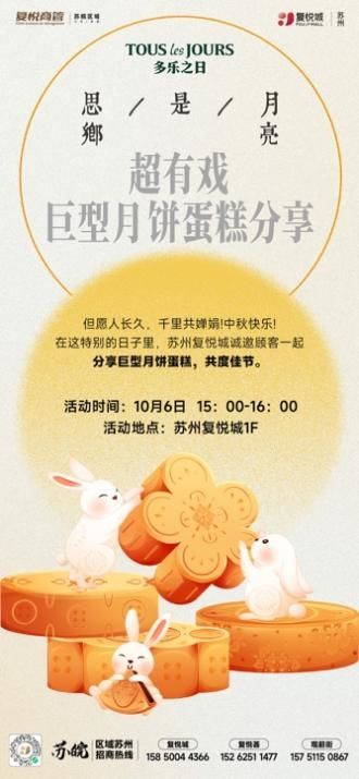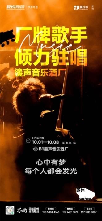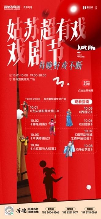 国庆假期,苏州复悦城好戏连台。10月1日至8日,每晚19:00-20:00将在1F外广场上演八大经典剧目,包括《西游记》、《哪吒闹海》、《诗仙李白》等,打造假日户外剧场。10月6日15:00特别设置“巨型月饼蛋糕分享”环节,与顾客共庆中秋。同时,B1层音乐酒厂每晚均有歌手驻唱,为市民提供从早到晚的沉浸式节日体验。