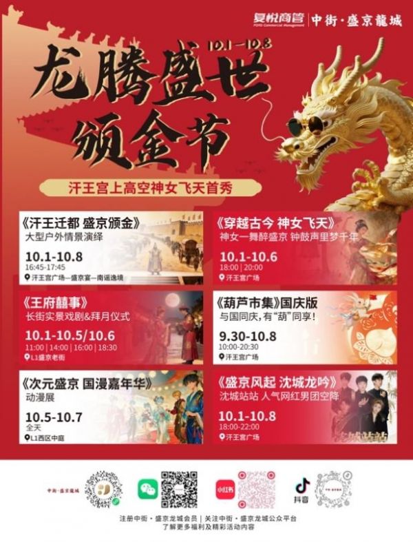 沈阳中街·盛京龙城推出“龙腾盛世颁金节”主题系列活动,以情景演绎、实景戏剧、非遗市集与国风演出,打造沉浸式文旅体验。每日16:45-17:45,大型户外情景剧《汗王迁都 盛京颁金》将在汗王宫广场上演,再现历史迁都场景;夜晚则有《神女飞天》表演于18:00及20:00优雅呈现。同期推出《王府囍事》长街实景戏剧、非遗美食汇聚的“葫芦市集”,以及人气男团“沈城站站”国风舞蹈演出。从历史场景到现代演绎,盛京龙城以多元内容构筑一场贯穿古今的城市嘉年华。