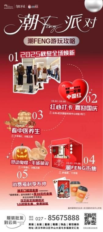 云尚·武汉国际时尚中心以“潮FENG派对”为主题,集结时尚、文化、市集与艺术,打造汉正街一站式漫游体验。活动现场设置超大爱国红心打卡点、潮FENG主题市集(涵盖文创、非遗、鬼怪万圣与中医养生专区)及江汉大学时尚设计作品展,其中《黑神话:悟空》主题服装将惊艳亮相。会员可享停车券、咖啡券及明信片寄送等多重礼遇,小红书/抖音打卡还有机会赢最高千元现金券。活动同期推荐探访保寿硚、消防博物馆等历史景点,体验汉正街360余年商业文脉与当代时尚的碰撞。