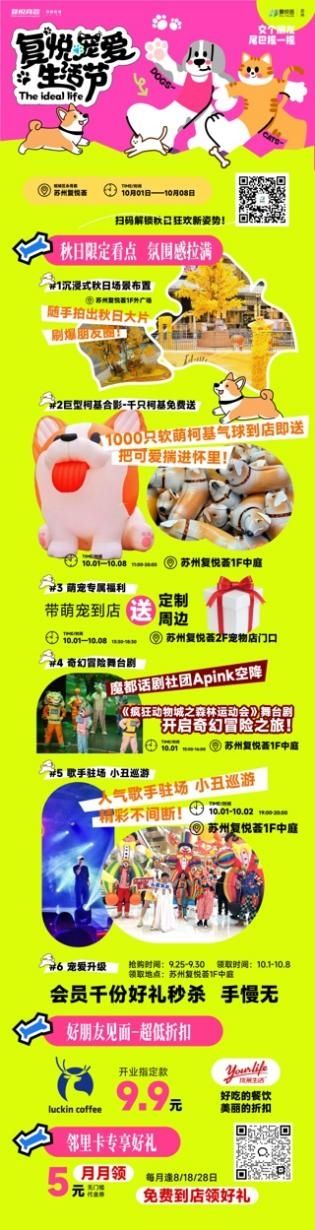苏州复悦荟国庆期间推出系列主题活动,打造集亲子、音乐、萌宠与优惠于一体的假日体验。10月1日至2日每晚19:00-20:00,1F中庭将上演“歌声漫城”驻唱表演;同期举办“疯狂s动物城森林运动会”亲子互动,陪伴家庭共度欢乐午后。萌宠爱好者可参与“尾巴摇一摇”互动,现场领取千只柯基造型气球,或抢购超值饮品券及餐饮满减券,尽享秋日惬意时光。