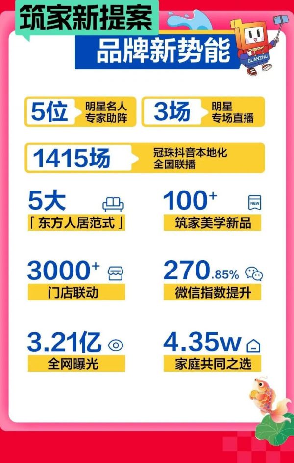 用“美的生活”迭代“好的生活。8月24日至9月21日,冠珠锦鲤节第七季携手全球品牌代言人迪丽热巴、冠珠明星屋主刘迦、费启鸣、易大千共同发声,以「东方人居范式」为大美筑家做新提案,以惠民行动让中国美走进千家万户,成就3.21亿全网曝光、4.35w家庭的共同之选。