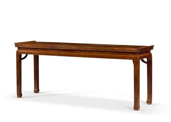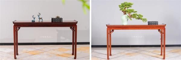而此次佳士得拍卖成交之首有束腰霸王枨翘头桌,巧夺天工红木也打造有相似的家具——霸王枨翘头案,二者差别在于“案”指四腿足在四角内缩安装,腿的位置缩进来一块为案,腿的位置顶住四角为桌。