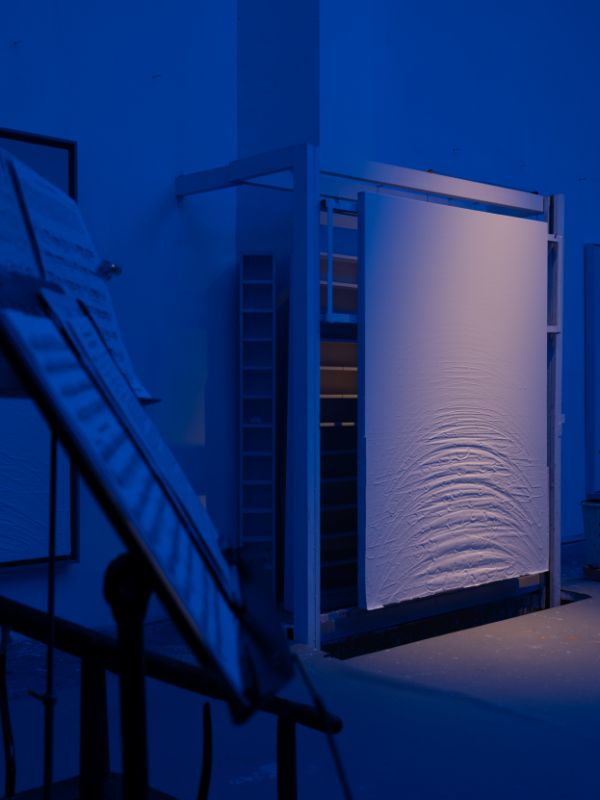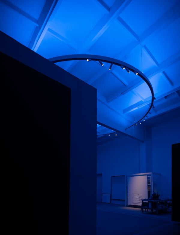 改造之前的世界是散乱疏离的,我们用光重构了一个世界,这就是悬浮在半空中的光环的由来。光环向上散发出的光线,弥漫整个工作室。随着色彩的变化,杨黎明在其中不断地穿越,带领着,在他曾经构建的世界中来回跳跃,让人们感受他生命中的轻重、高低变化 。