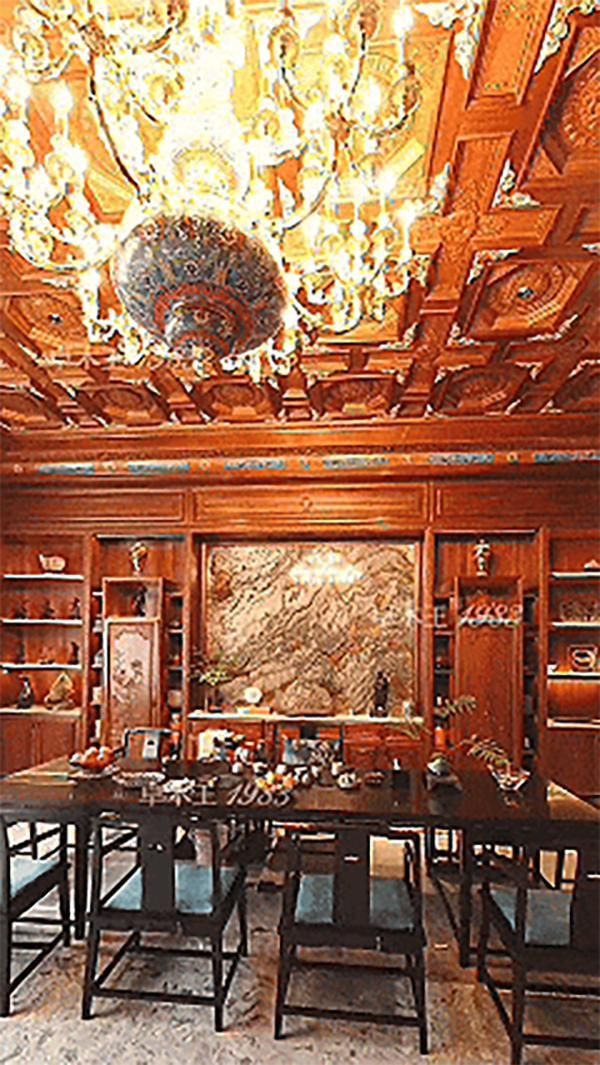 材质选用:缅甸柚木整装×东阳木雕×紫光檀茶台×景泰蓝吊灯×藻井式天花板