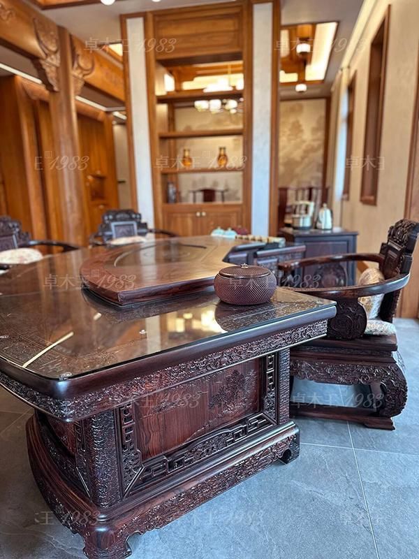 风格特点:萃取中国古典美学的精髓,精选高端红木材质,融东阳木雕、古典绘画于一体,以精湛雕刻见意境,以木韵衬茶香,营造当代世家大族的精神栖居地。