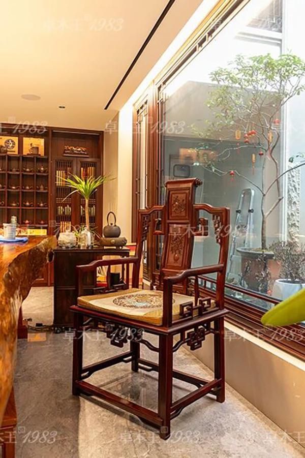 艺术收藏家的茶空间,3.6米金丝楠木茶桌纹理如画、堪称珍品,搭配大红酸枝茶椅。通透的背景墙既分隔空间,又引光纳景。