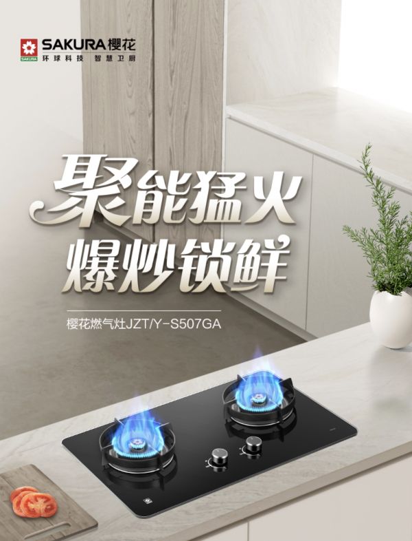 樱花燃气灶S507GA以稳燃的火力和人性化的安全设计,助力厨房里的安心烹饪,默默守护家中烟火时刻。