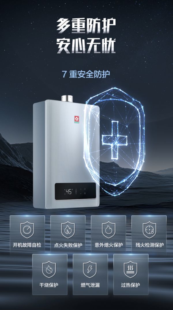 安全,是品质生活的底色。樱花燃气热水器Q303内置七重安全防护系统,包含开机自检、点火失败保护、意外熄火保护、残火检测、干烧保护、燃气泄漏报警、过热保护。无论使用前还是使用中,安全都始终伴随左右,让每一次沐浴都无忧。