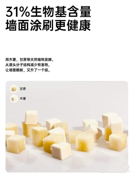半森不用传统石油基底提取乳胶漆,而是选择用甘蔗,木薯等天然植物来做漆。高达31% 的生物基含量,从源头上就能减少有害物质的生成。刷的时候压根不用戴口罩,凑近闻是刚割过的青草味,没有刺鼻感也没有“香精盖味” 的闷感,小编这种严重鼻炎,刷的全过程没打过喷嚏。